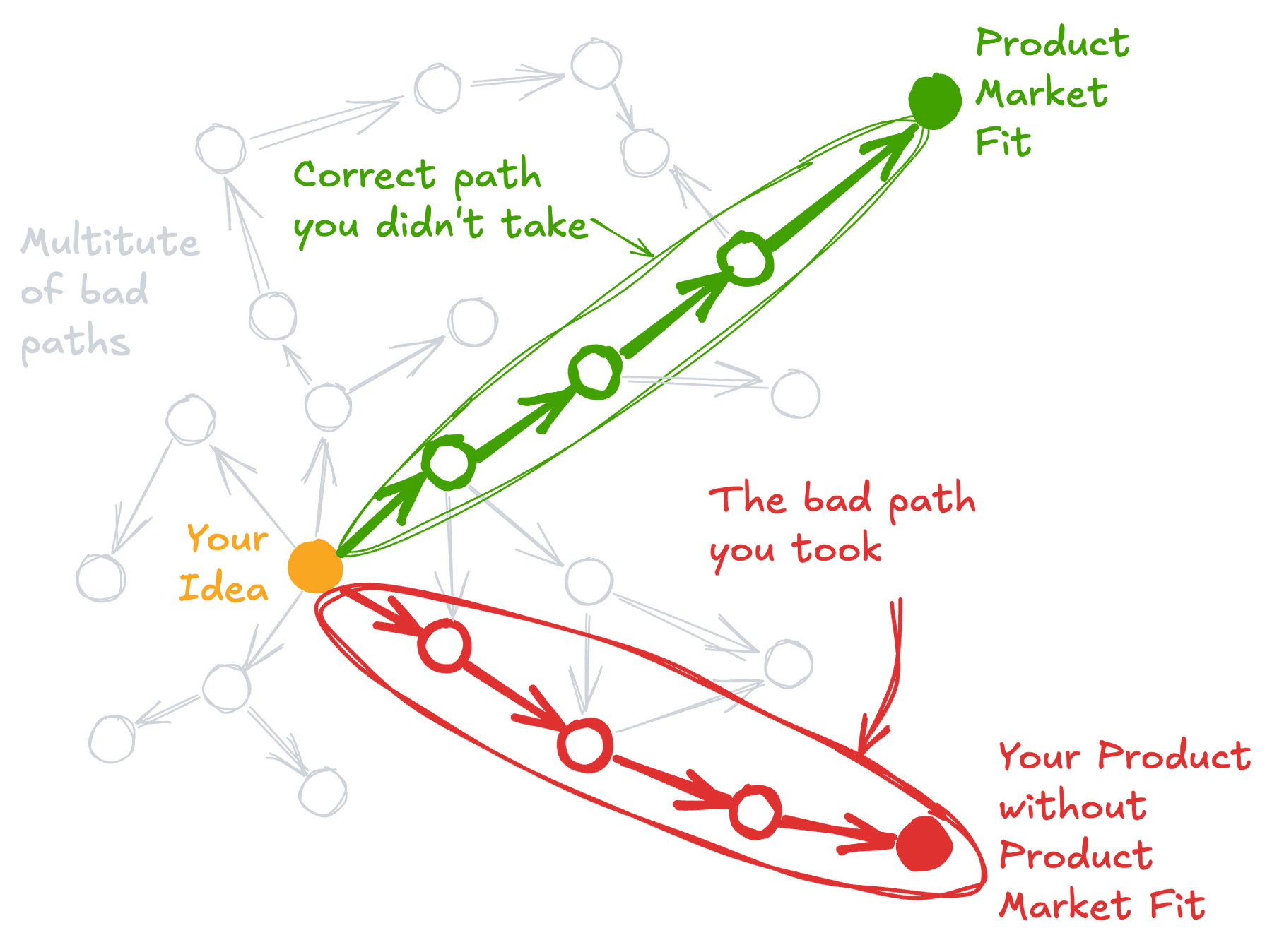Invention moves quickly by nature. If you rush it, you’ll likely grab the first idea instead of the best one.Each decision (the circles on the drawing) closes off other paths. Early in the process, possibilities are wide open - but once you progress, options shrink and the cost of change gets higher. That’s why you should move deliberately when inventing. Some paths you skip might have led to real success.Don't kill success with speed.